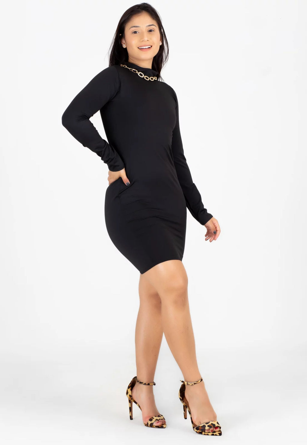 Vestido Feminino Manga Longa e Gola Alta Tubinho Preto